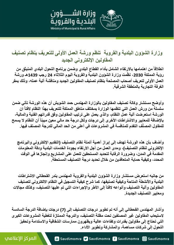 وزارة الشؤون البلدية والقروية On Twitter وزارة الشؤون البلدية والقروية تنظم ورشة العمل الأولى للتعريف بـ نظام تصنيف المقاولين الإلكتروني الجديد بالتعاون مع غرفة الشرقية ورش عمل نظام التصنيف Https T Co T6dofaeybh