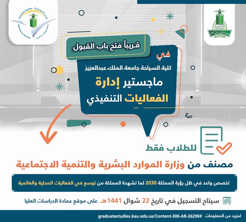 كلية السياحة Pa Twitter قريبا في كلية السياحة يتاح التسجيل في ماجستير إدارة الفعاليات التنفيذي للسنة الدراسية القادمة 1441 1442 لمزيد من المعلومات Https T Co Xzohyxloij Https T Co Nqc1yaci28