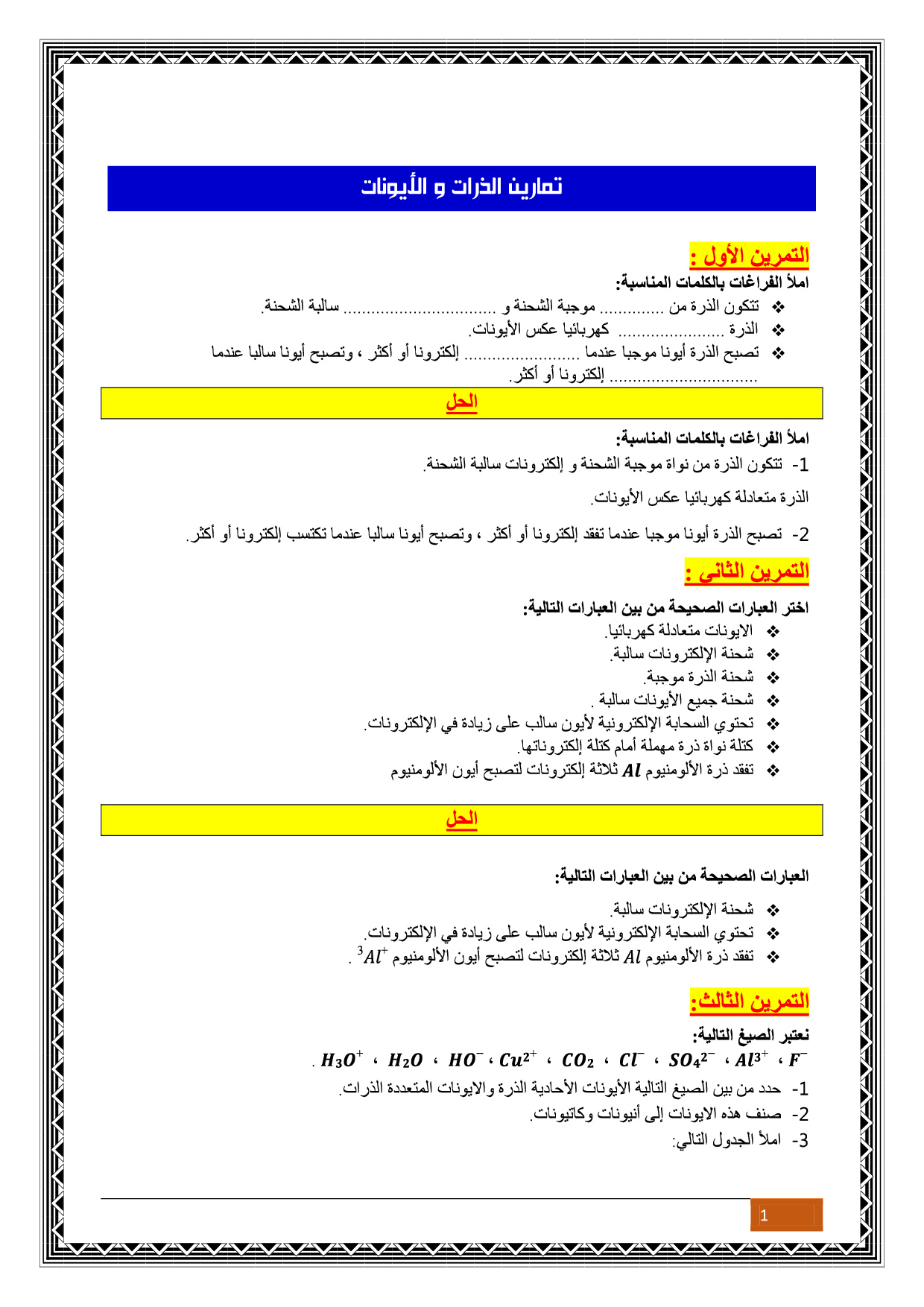 المواد والكهرباء الذرات والأيونات تمارين محلولة 2 Alloschool