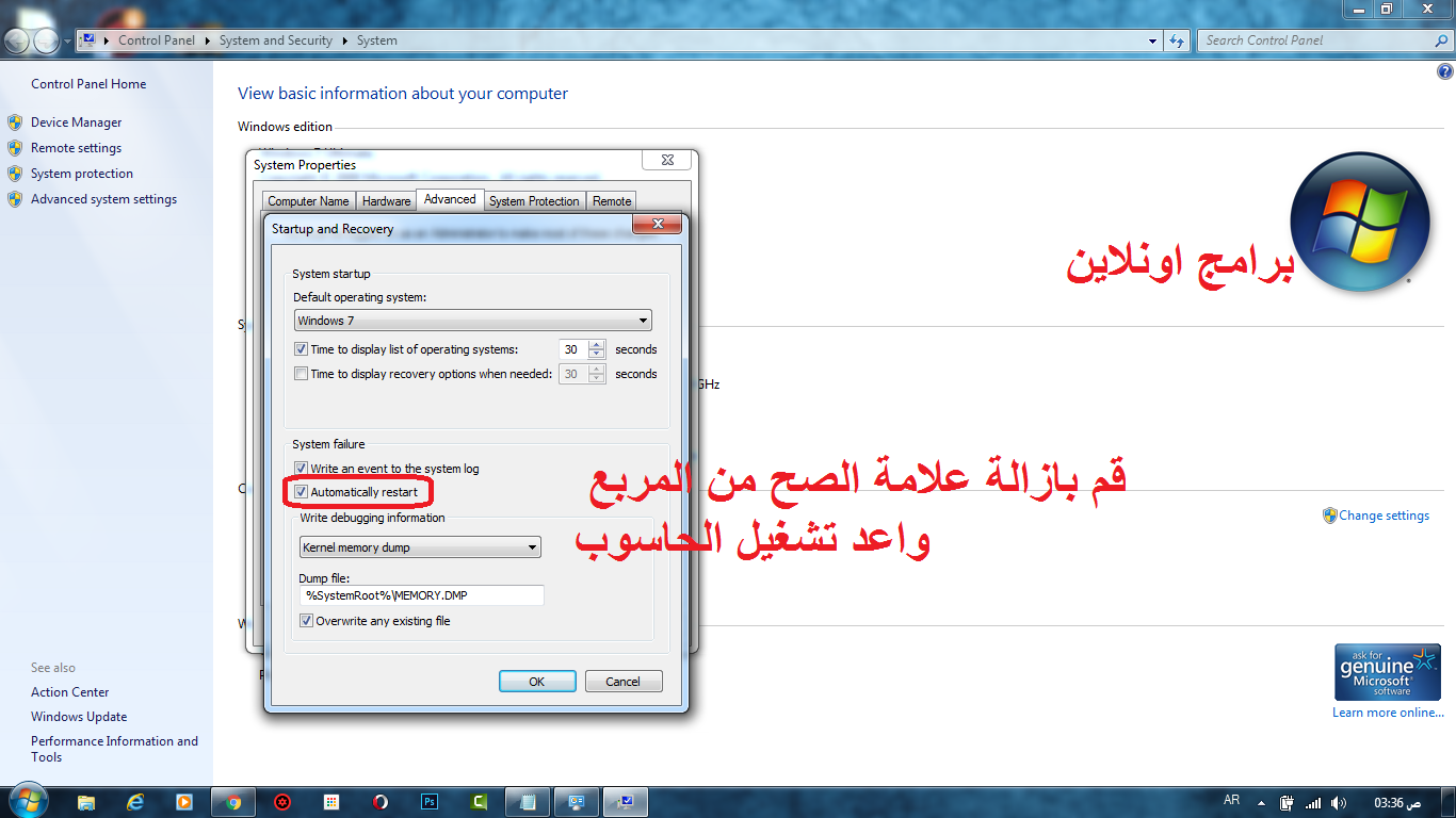 حل مشكله الشاشه الزرقاء واعادة التشغيل التلقائي لويندوز 7