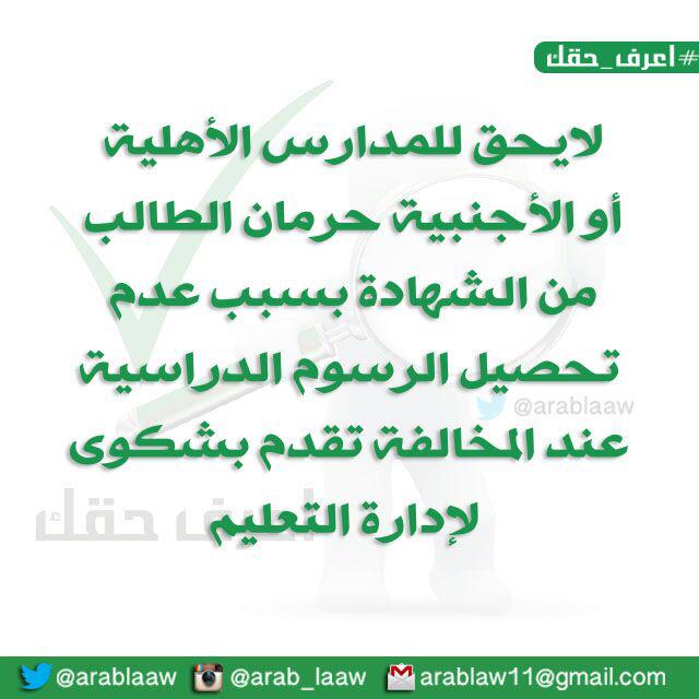 اعرف حقكさんのツイート اعرف حقك لايحق للمدارس الأهلية حرمان الطالب من الشهادة بسبب عدم تسديد الرسوم عند المخالفة تقدم بشكوى لإدارة التعليم Http T Co Peaoskmyxu
